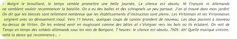 « ... vers 6h50, un coup de canon retentit à l'orée du bois de Virton. (...) On crut à un bombardement, et la population affolée, se réfugia dans les caves. Puis ce fut une canonnade épouvantable, à laquelle répondit une batterie française installée au-dessus de Saint-Mard. Mais, Virton n'était pas le but des projectiles ennemis. Il fut bientôt évident que le Collège Saint-Joseph seul était visé. N'était-ce pas une grande maison religieuse et l'ambulance qui renfermait le plus de blessés français. (...) Quatre grands drapeaux de la Croix-Rouge flottaient sur les toits; ils étaient visibles de tout le champ de bataille.(…) Le bombardement dura une heure. (...) Six tombèrent sur les bâtiments. Plus de trois mille vitres tombèrent en éclats; des toitures, des salles de classe et d'étude, des quartiers de professeurs, et les cabinets de la cour ne présentent plus qu'un amoncellement chaotique de débris sans nom. Spectacle affreux: douze blessés, dont trois Allemands, gisaient morts sous les débris... ».